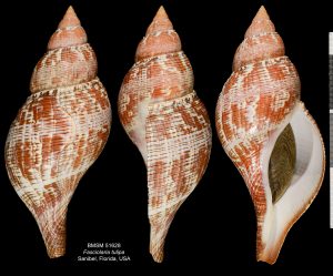 Read MoreShell size to 120 mm; shell fusiform, similar to Fasciolaria tulipa, but smaller. Body whorl exhibits 5 to 6 dark brown, widely spaced, spiral lines. Background color is grayish with darker bluish-gray streaks. Mottled with purplish-brown or brown. The additional photo, taken by Amy Tripp near Marco Island, shows a female banded tulip in the process of laying egg cases. The greenish color on the shell is most likely caused by a layer of microscopic green algae. The egg cases in the third image were laid in a Museum aquarium. The egg case looks like a small version of that of the true tulip, minus the frilled edges. The last supplementary image of a female individual with egg cases was taken by Amy Tripp on Kice Island, Florida.