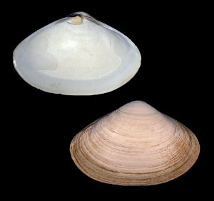 Read MoreMeasuring up to 50 mm (about 2 inches), Rangia cuneata (also known as Gulf Wedge Clam) is a brackish water bivalve native to the Gulf of Mexico. The shell is heavy, whitish, and normally covered with a thick brown periostracum. As with most species of the family Mactridae, the ligament is internal. Capable of withstanding very low water salinities, the species has invaded estuaries of the East Coast of the US and northern Europe. The species is found locally in the Caloosahatchee estuary, where it thrives upstream almost to Lake Okeechobee. The shell in the main image was collected in 1958, by Dale Stingley, in La Belle, Hendry County, Florida. The additional image shows unpaired valves collected in 2019 by Lorin Buckner, under the Caloosahatchee River’s Midpoint Bridge (between Fort Myers and Cape Coral.) All photos by Patricia Starkey.