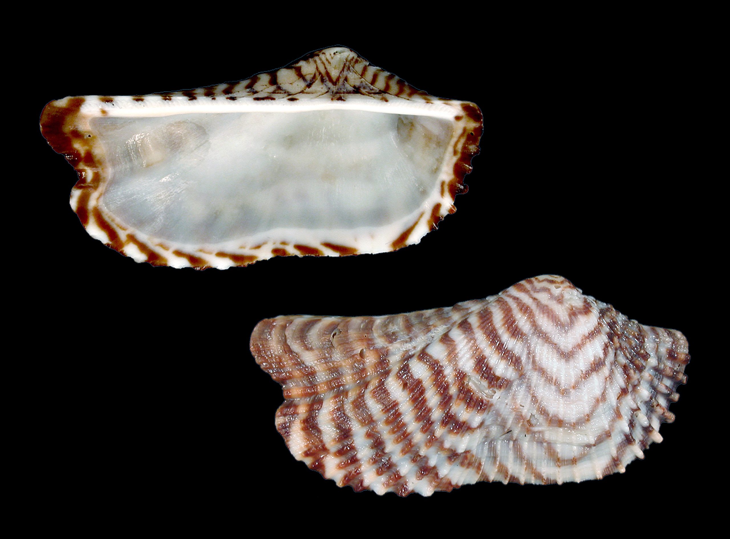Shell size to 80 mm; shell elongate-rectangular (twice as long as high), equivalve. Hinge long, straight. Sculpture of about 26, irregular radial ribs, and fine concentric threads that cross ribs and interspaces. Byssal gap present opposite to hinge, moderately large. Periostracum brown and dense on fresh shells, covering color pattern almost completely. Color creamy-white, streak with reddish- to dark-brown wavy bands. Attached by byssus onto hard substrates.